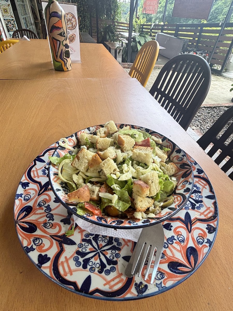 Una pizza muy rica considerando el lugar donde está ubicado. Masa delgada crunchy y varias opciones. La que tiene presto, tomate cherry y aceutinas muy recomendada. La de pollo bbq también rica. Precio de una pizza personal (4 porcinones) a 15mil, la mediana a 25mil. Juegos 6mil. El ambiente es muy ameno, pegado a la carretera pero es cómodo. El servicio un poco lento pero es de los pocos lugares en la carretera que tiene parqueadero, buena comida que no sea tradicional.